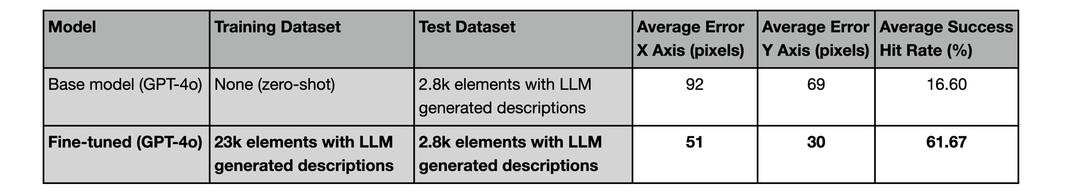 Vision models like GPT-4o struggle with tasks that require precise spatial localization. We evaluated the performance of GPT-4o (zero-shot) to estimate the center coordinates of a UI element from a text description. Then, using a dataset of website screenshots, we fine-tuned the base model improving the success hit rate by 272%.