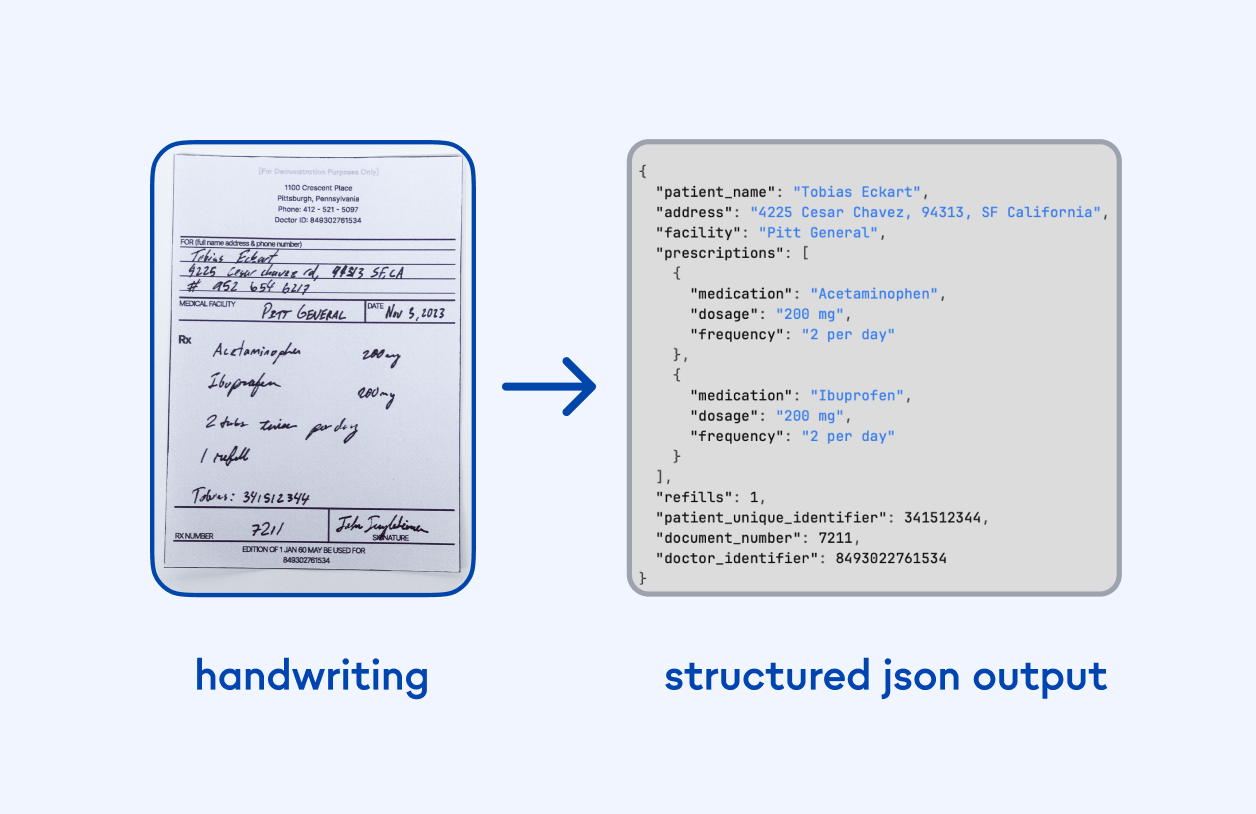 We used a mix of complex digital and handwritten health insurance documents (>15 schema fields with recursion). The evaluation is based on similarity between our ground truth dataset of manually labeled documents. Looking forward, we are certain that GPT vision models can surpass the performance of traditional IDP systems due to their end-to-end design. This allows the model to capture the relationships that exist within industry-specific data.